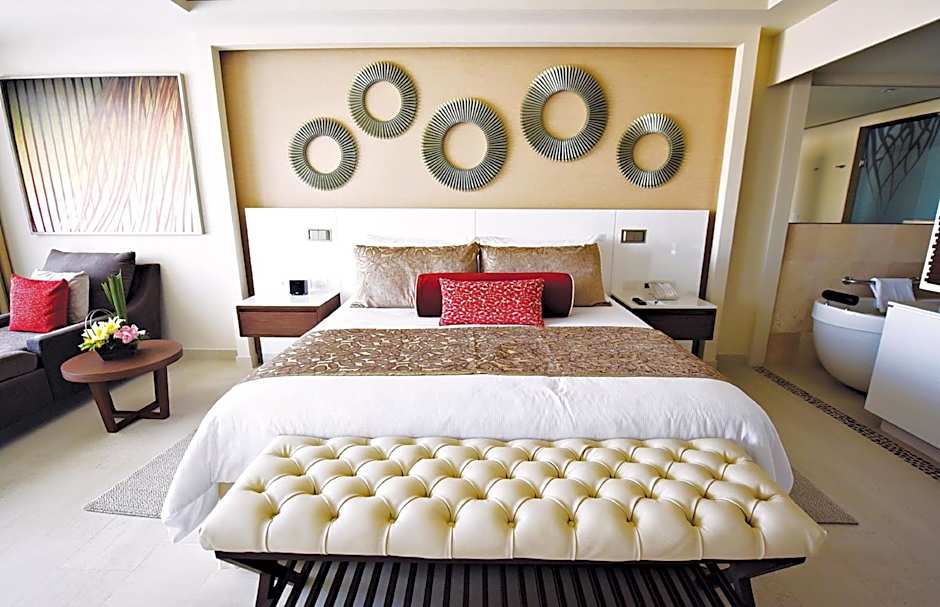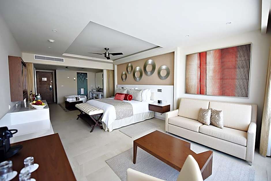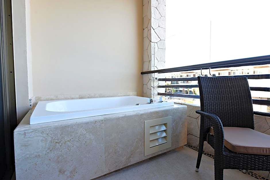 This suite features a balcony, sofa and hot tub.